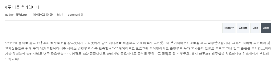 13년만에 둘째를 갖고 산후조리 해주실분을 찾고잇다가 인터넷에서 맘스 매니져를 처음보고 어째야할지 고민햇는데 후기적어주신것들을 보고 결정햇엇습니다. 그래서 저처럼 고민하며 찾고계신분들을 위해 후기 남겨드립니다. 4주 서비스 받앗구요 아주 만족합니다^^ 체계적으로 프로그램 되어잇어서도 좋앗구요 누가 오시는지 얼굴도 모르고 그냥 믿고 좋은분 오시길....바라기만 햇엇는데 관리사님도 너무 좋으셧습니다. 남편도 13살 큰딸아이도 관리사님 좋으시다고 음식도 맛잇다고 잘먹고 잘 지냇구요. 혹시 산후조리해주실분 찾으신다면 맘스매니져 추천해드립니다!